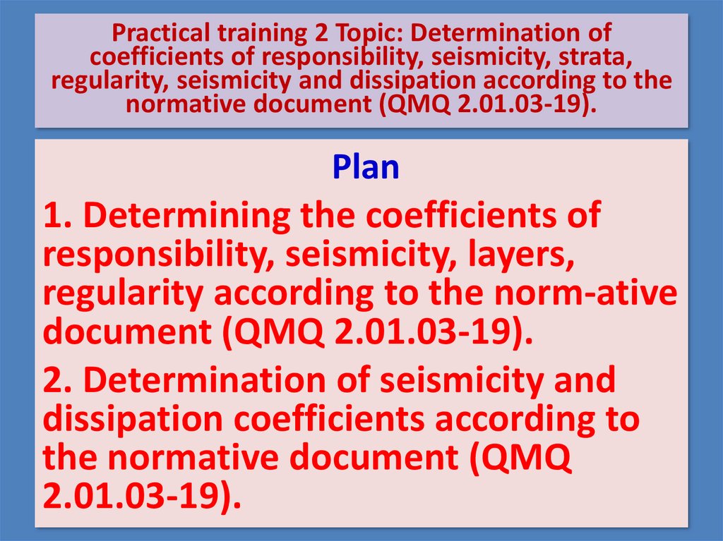 Practical training 2 Topic: Determination ofcoefficients of responsibility, seismicity, strata,