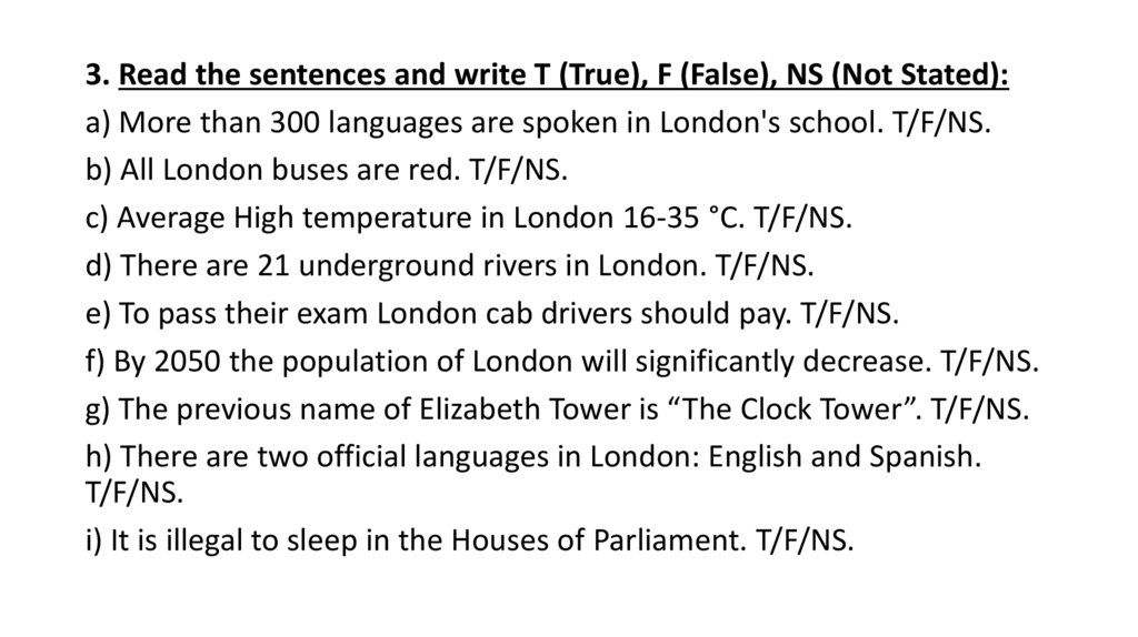 3. Read the sentences and write T (True), F (False), NS (Not Stated):a) More than 300 languages are spoken in London's school. T/F/NS.