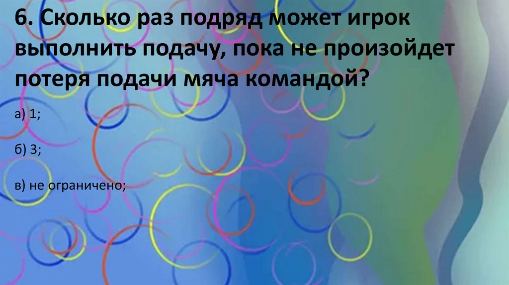 6. Сколько раз подряд может игроквыполнить подачу, пока не произойдет