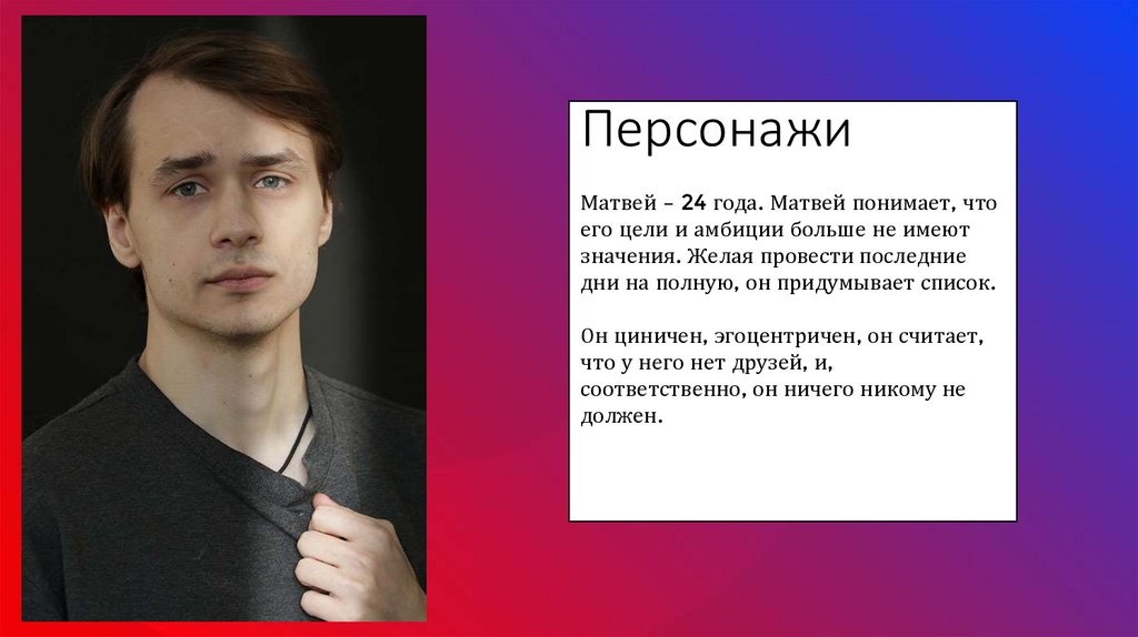 ПерсонажиМатвей – 24 года. Матвей понимает, что