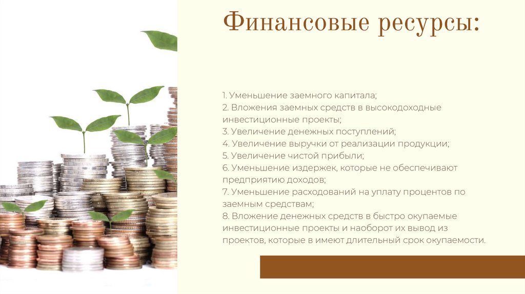 1. Уменьшение заемного капитала;2. Вложения заемных средств в высокодоходные