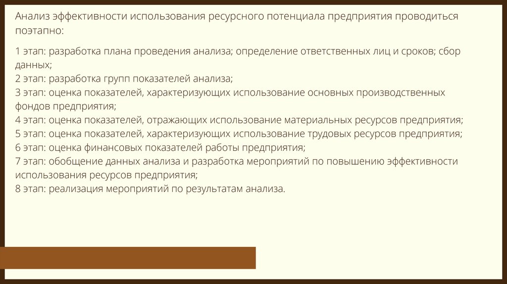 Анализ эффективности использования ресурсного потенциала предприятия проводитьсяпоэтапно: