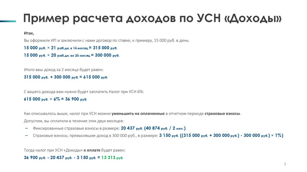 Вы оформили ИП и заключили с нами договор по ставке, к примеру, 15 000 руб. в день.