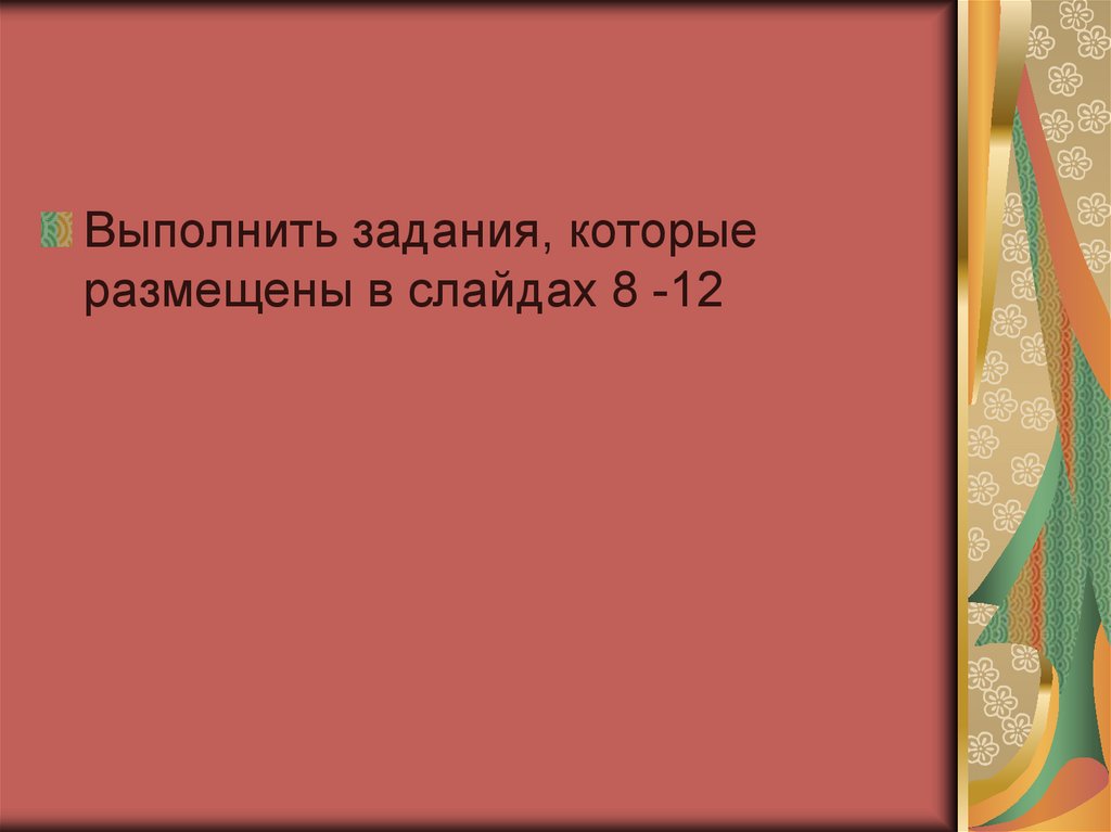 Выполнить задания, которыеразмещены в слайдах 8 -12