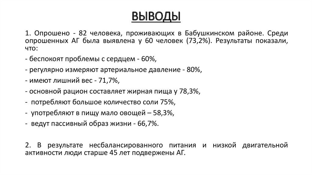 ВЫВОДЫ1. Опрошено - 82 человека, проживающих в Бабушкинском районе. Среди
