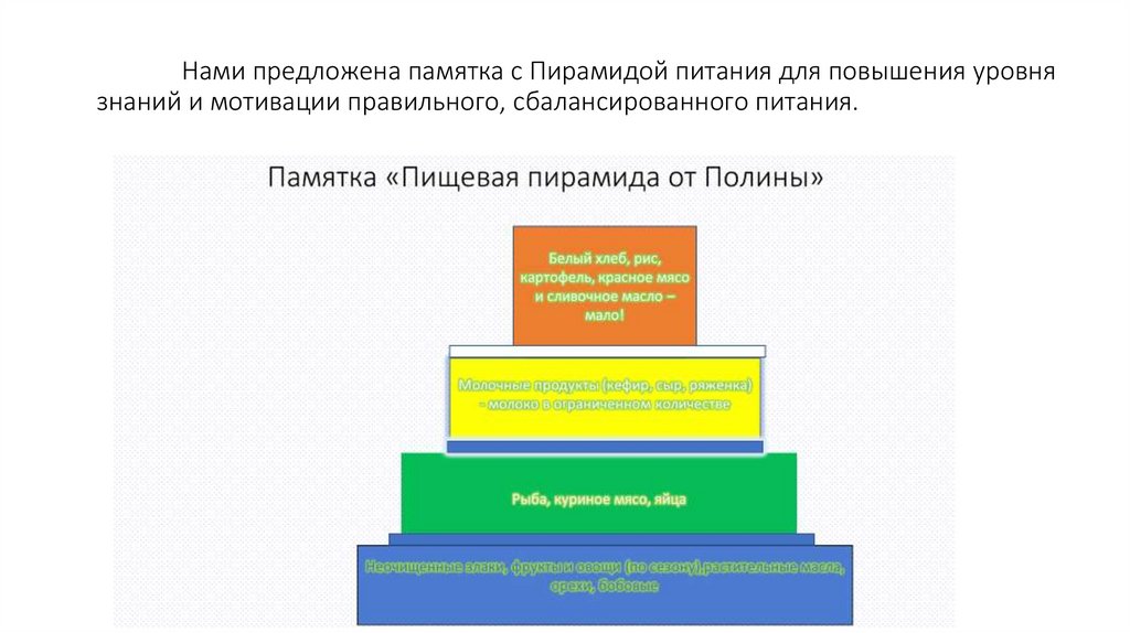 Нами предложена памятка с Пирамидой питания для повышения уровнязнаний и мотивации правильного, сбалансированного питания.
