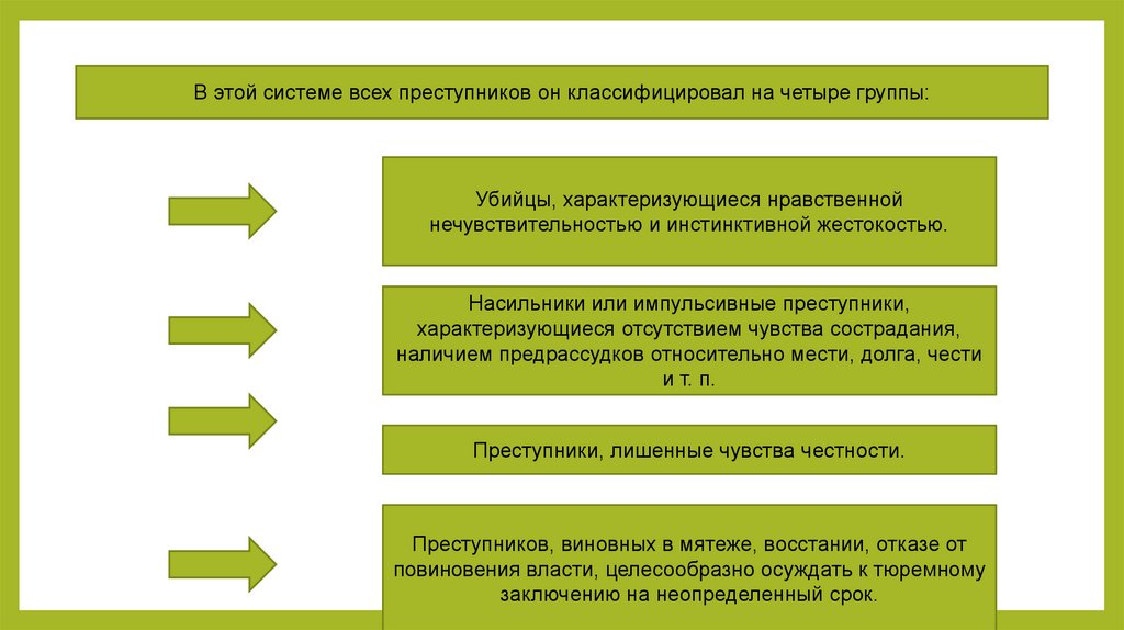 В этой системе всех преступников он классифицировал на четыре группы:Убийцы, характеризующиеся нравственной