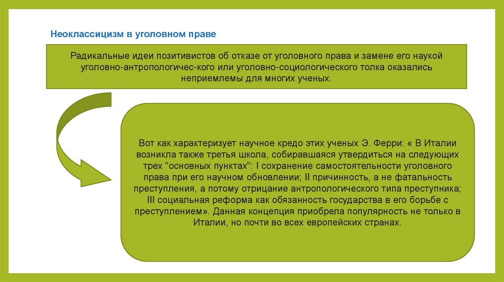 Неоклассицизм в уголовном правеРадикальные идеи позитивистов об отказе от уголовного права и замене его наукой