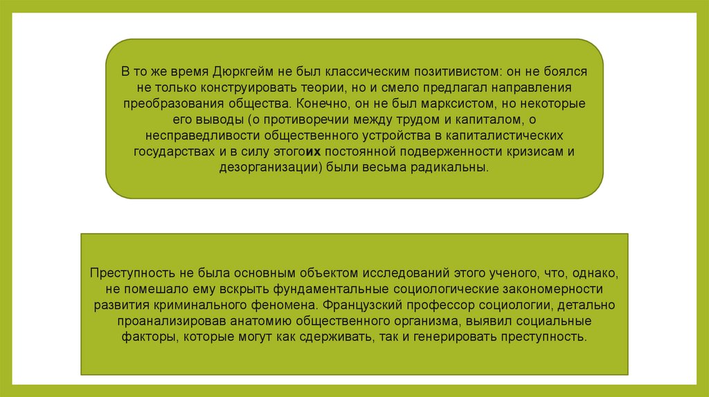 В то же время Дюркгейм не был классическим позитивистом: он не боялсяне только конструировать теории, но и смело предлагал направления