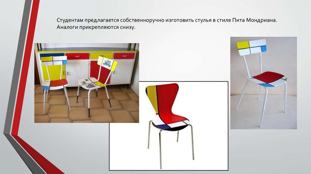 Студентам предлагается собственноручно изготовить стулья в стиле Пита Мондриана.Аналоги прикрепляются снизу.