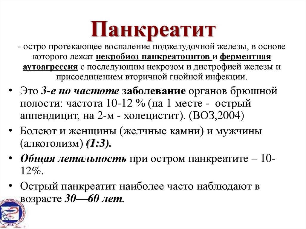 Панкреатит- остро протекающее воспаление поджелудочной железы, в основе