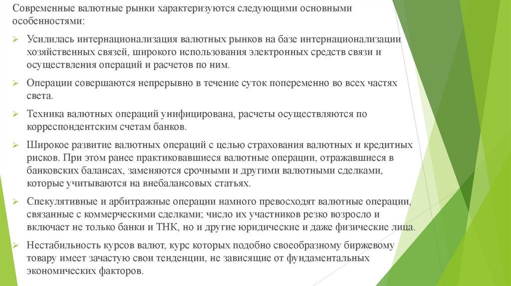 Современные валютные рынки характеризуются следующими основнымиособенностями: