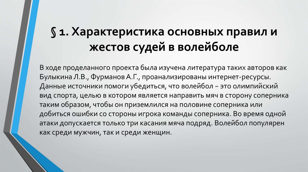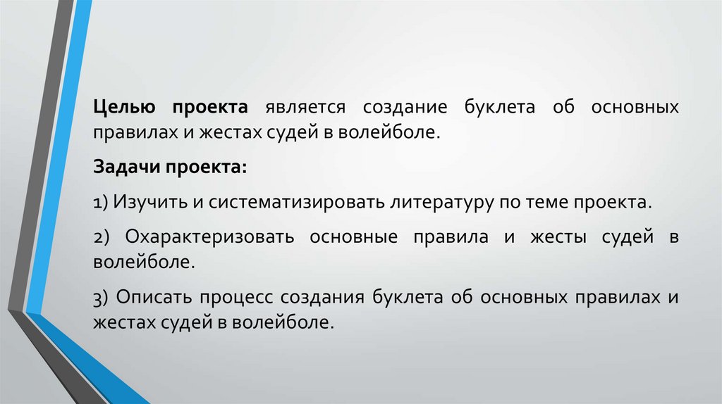 Целью проекта является создание буклета об основныхправилах и жестах судей в волейболе.