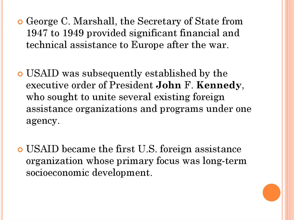 George C. Marshall, the Secretary of State from1947 to 1949 provided significant financial and