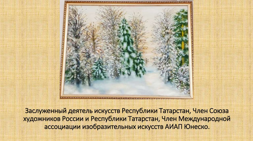 Заслуженный деятель искусств Республики Татарстан, Член Союзахудожников России и Республики Татарстан, Член Международной