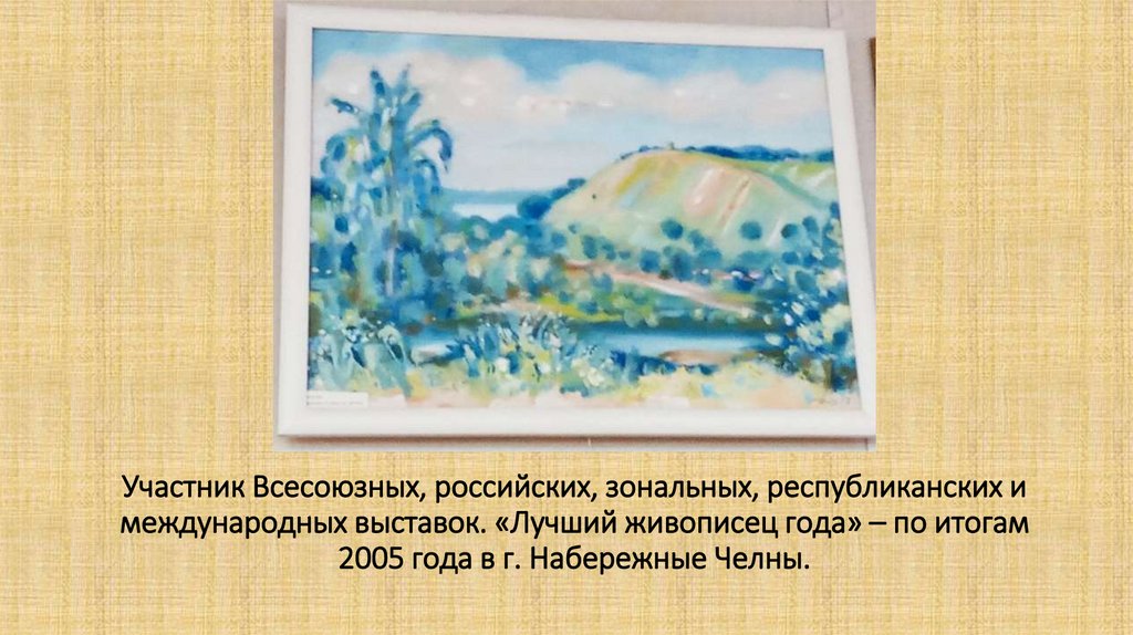 Участник Всесоюзных, российских, зональных, республиканских имеждународных выставок. «Лучший живописец года» – по итогам