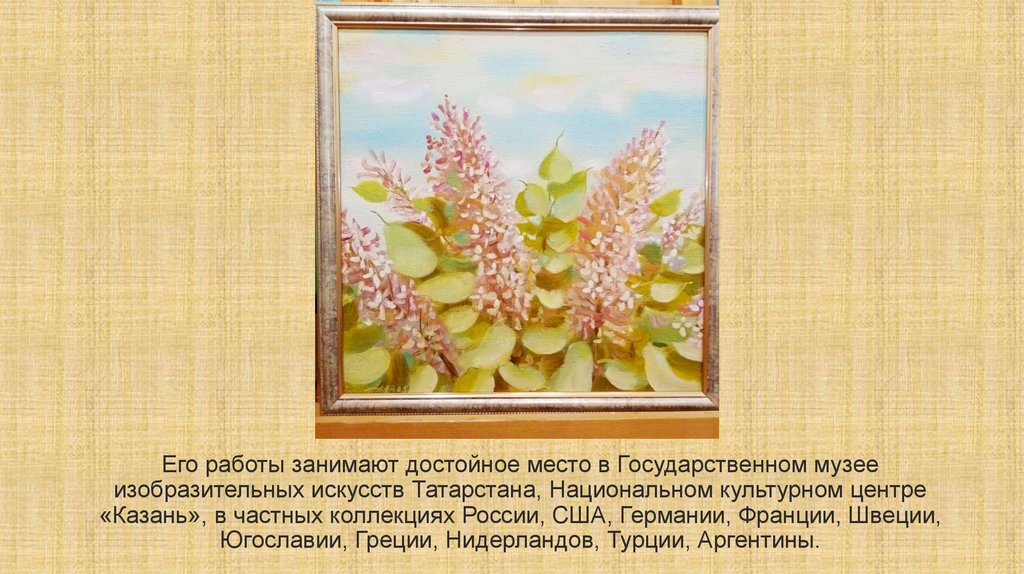 Его работы занимают достойное место в Государственном музееизобразительных искусств Татарстана, Национальном культурном центре