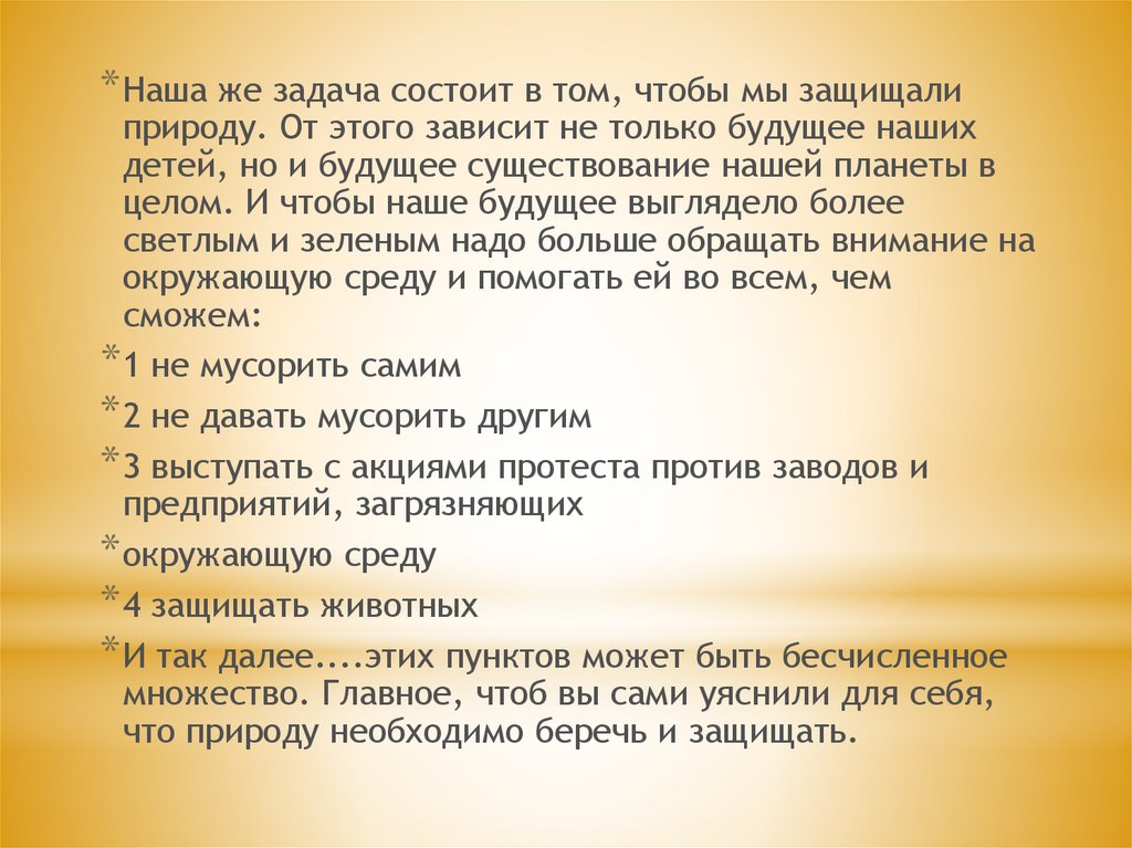 * Наша же задача состоит в том, чтобы мы защищалиприроду. От этого зависит не только будущее наших