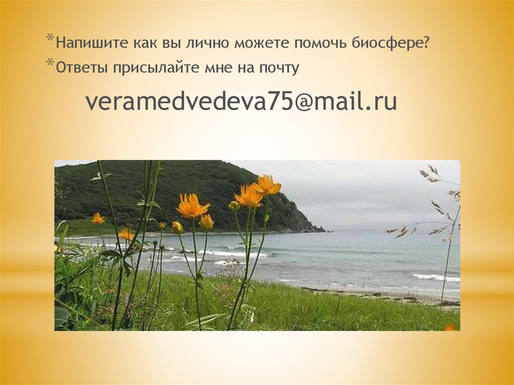 * Напишите как вы лично можете помочь биосфере?* Ответы присылайте мне на почту
