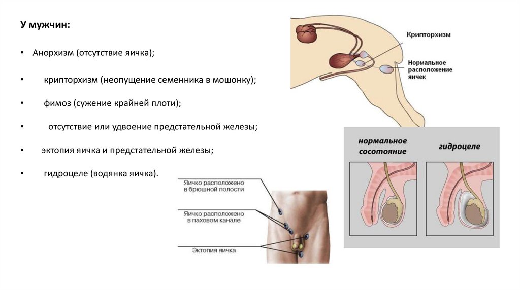У мужчин:• Анорхизм (отсутствие яичка);