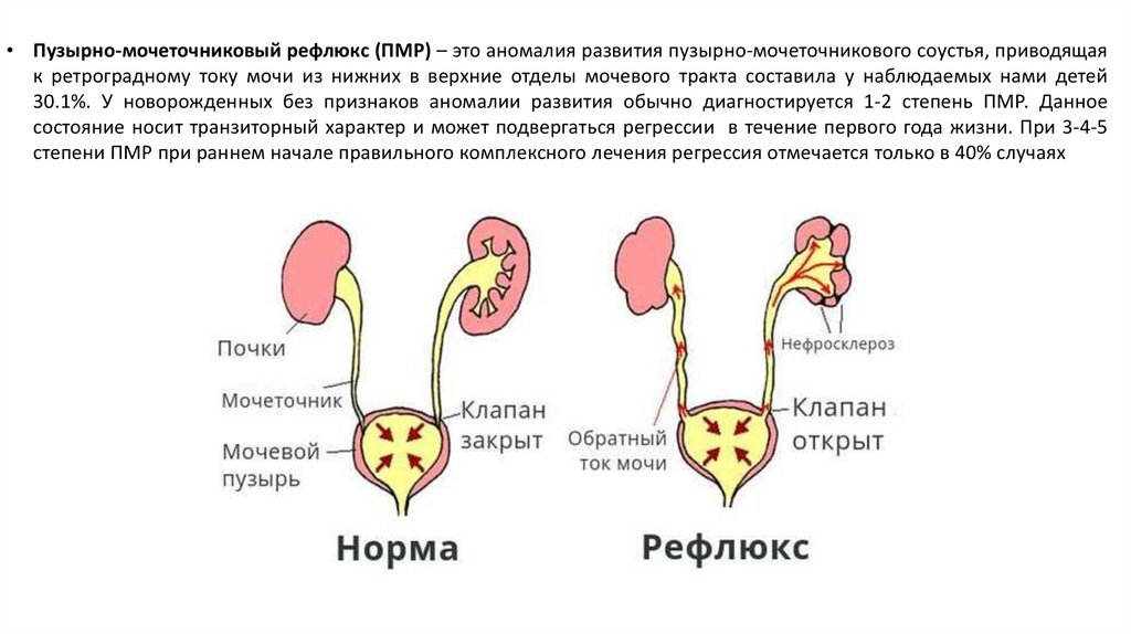 • Пузырно-мочеточниковый рефлюкс (ПМР) – это аномалия развития пузырно-мочеточникового соустья, приводящаяк ретроградному току мочи из нижних в верхние отделы мочевого тракта составила у наблюдаемых нами детей