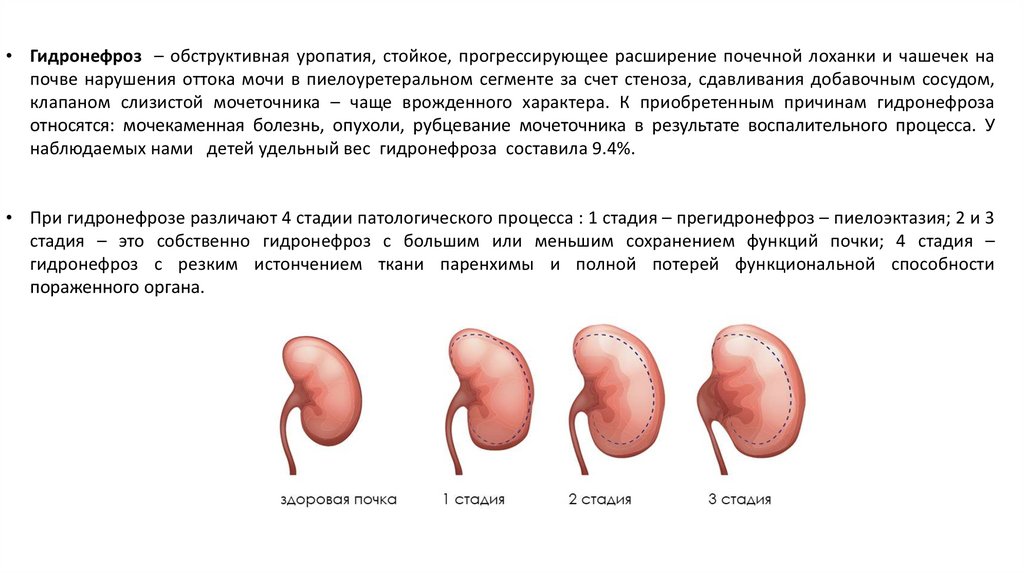 • При гидронефрозе различают 4 стадии патологического процесса : 1 стадия – прегидронефроз – пиелоэктазия; 2 и 3