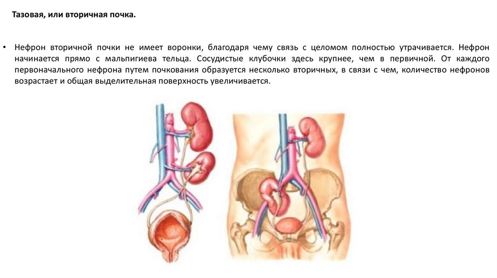 Тазовая, или вторичная почка.• Нефрон вторичной почки не имеет воронки, благодаря чему связь с целомом полностью утрачивается. Нефрон