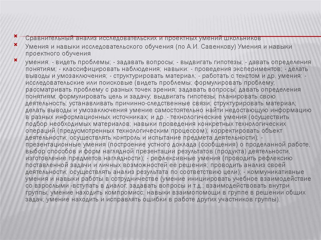 Сравнительный анализ исследовательских и проектных умений школьниковУмения и навыки исследовательского обучения (по А.И. Савенкову) Умения и навыки