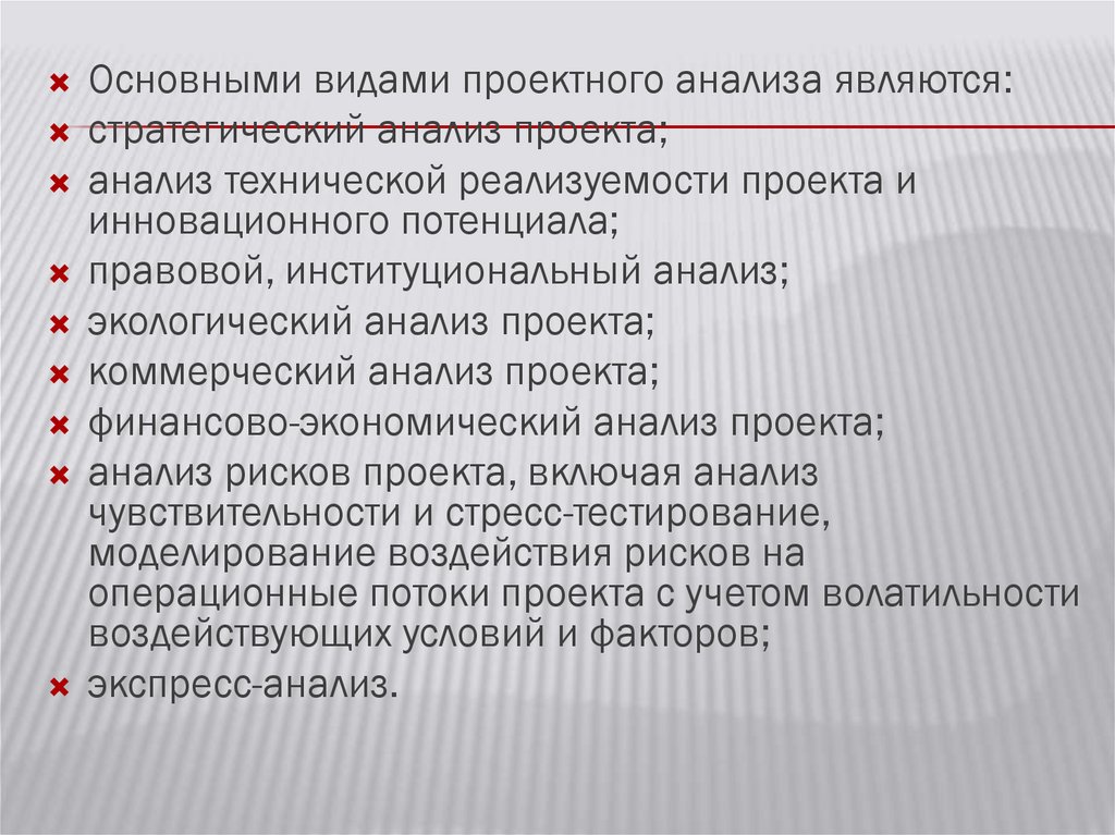 Основными видами проектного анализа являются:стратегический анализ проекта;