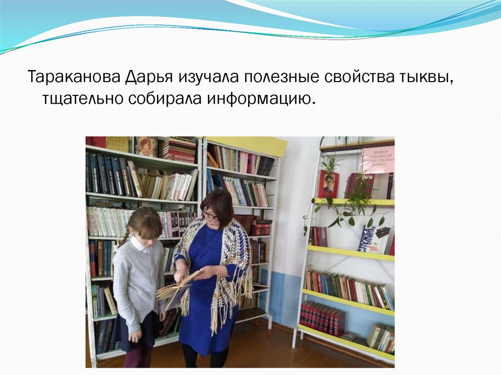 Тараканова Дарья изучала полезные свойства тыквы,тщательно собирала информацию.