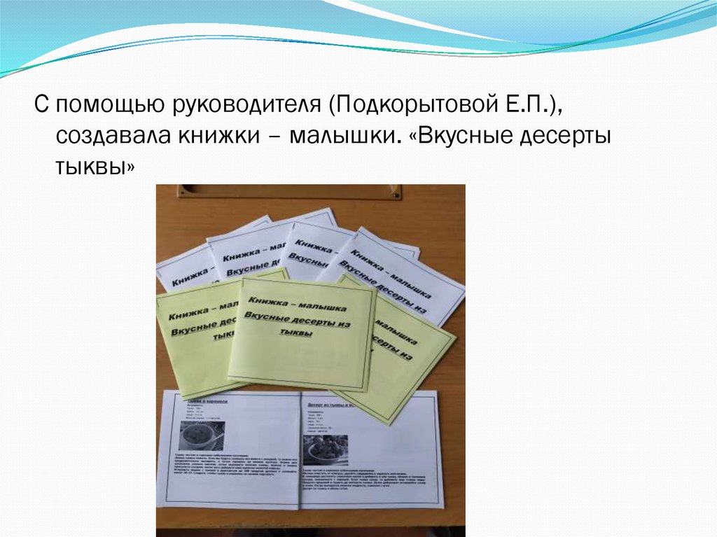 С помощью руководителя (Подкорытовой Е.П.),создавала книжки – малышки. «Вкусные десерты