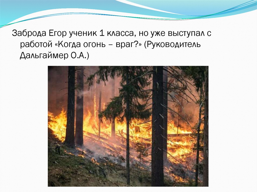 Заброда Егор ученик 1 класса, но уже выступал сработой «Когда огонь – враг?» (Руководитель