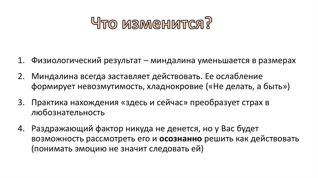 1. Физиологический результат – миндалина уменьшается в размерах2. Миндалина всегда заставляет действовать. Ее ослабление