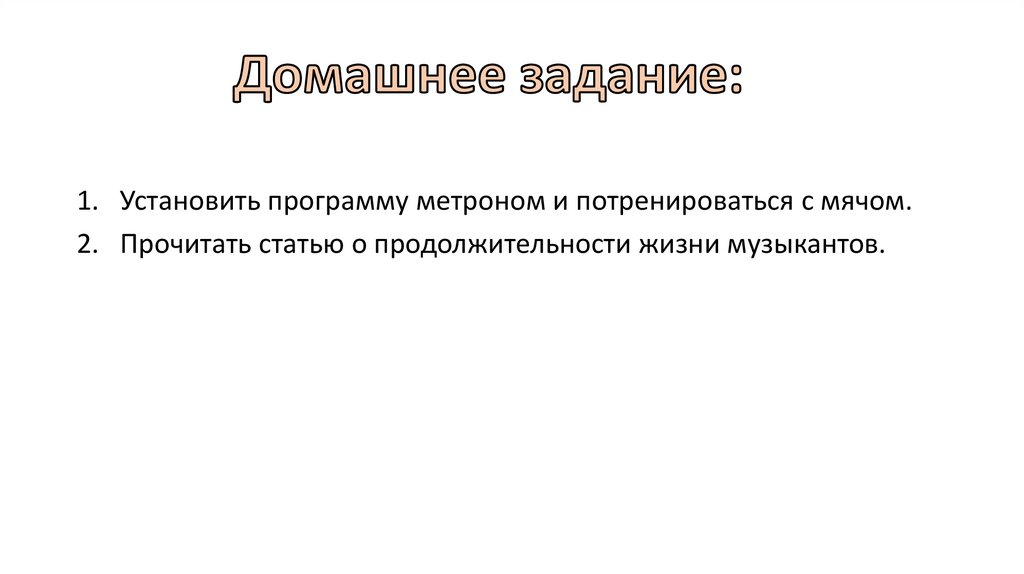 1. Установить программу метроном и потренироваться с мячом.2. Прочитать статью о продолжительности жизни музыкантов.