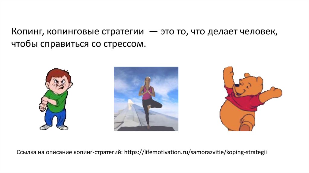 Копинг, копинговые стратегии — это то, что делает человек,чтобы справиться со стрессом.