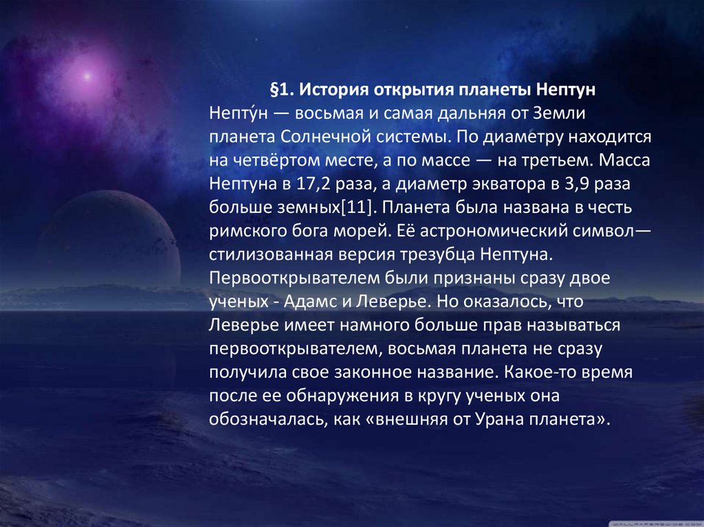 §1. История открытия планеты НептунНепту́н — восьмая и самая дальняя от Земли