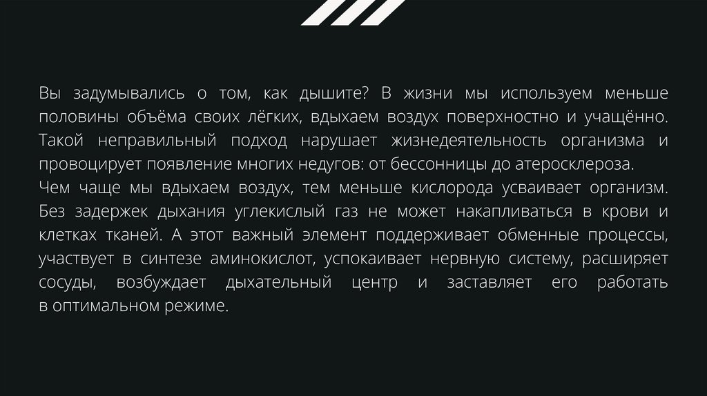 Вы задумывались о том, как дышите? В жизни мы используем меньшеполовины объёма своих лёгких, вдыхаем воздух поверхностно и учащённо.