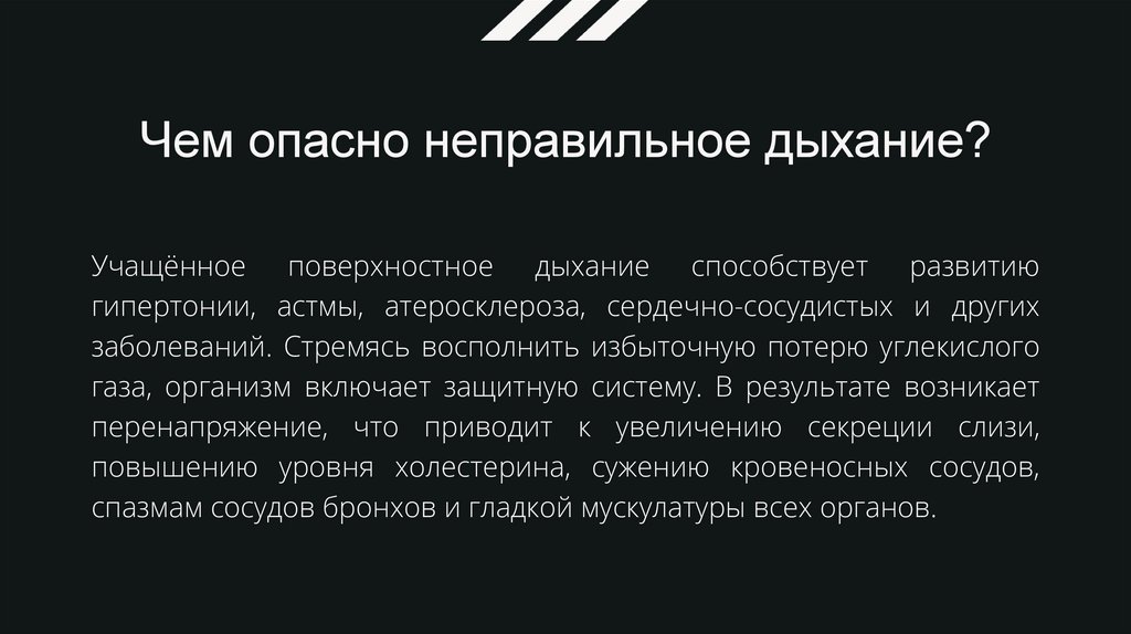 Чем опасно неправильное дыхание?Учащённое поверхностное дыхание способствует развитию
