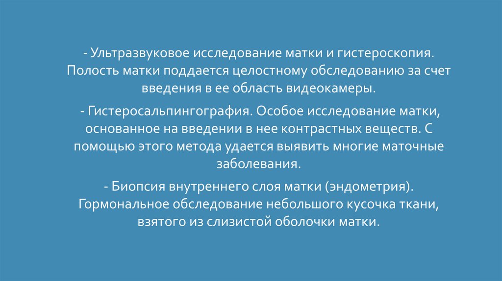 - Ультразвуковое исследование матки и гистероскопия.Полость матки поддается целостному обследованию за счет