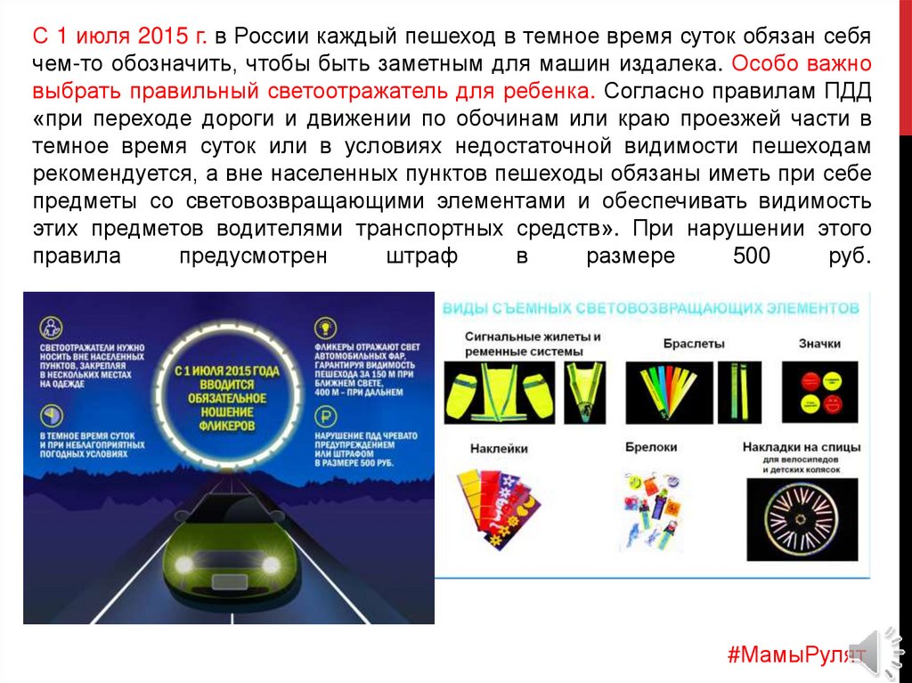 С 1 июля 2015 г. в России каждый пешеход в темное время суток обязан себячем-то обозначить, чтобы быть заметным для машин издалека. Особо важно