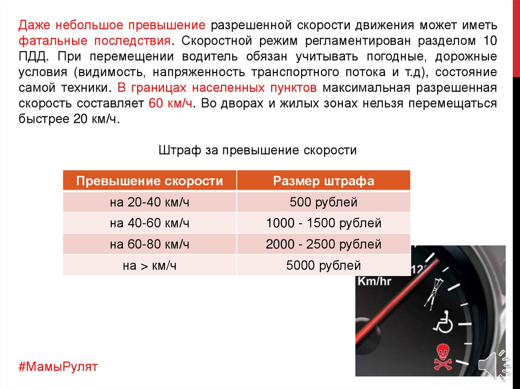 Даже небольшое превышение разрешенной скорости движения может иметьфатальные последствия. Скоростной режим регламентирован разделом 10
