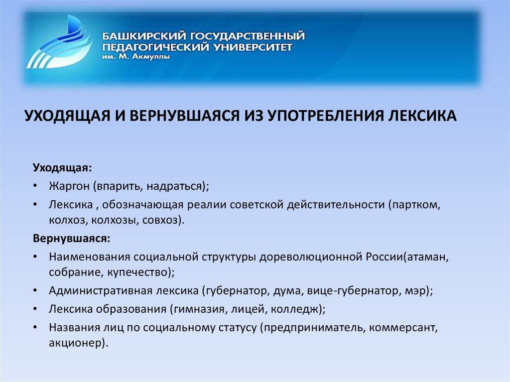 УХОДЯЩАЯ И ВЕРНУВШАЯСЯ ИЗ УПОТРЕБЛЕНИЯ ЛЕКСИКАУходящая: