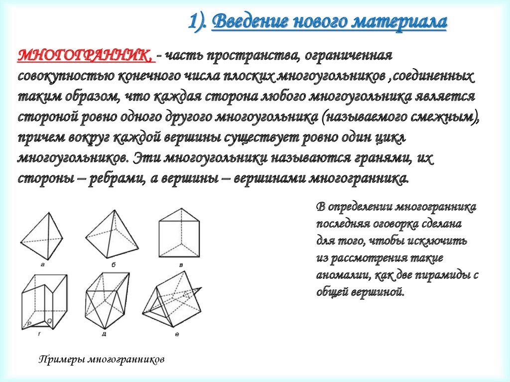 1). Введение нового материалаМНОГОГРАННИК, - часть пространства, ограниченная