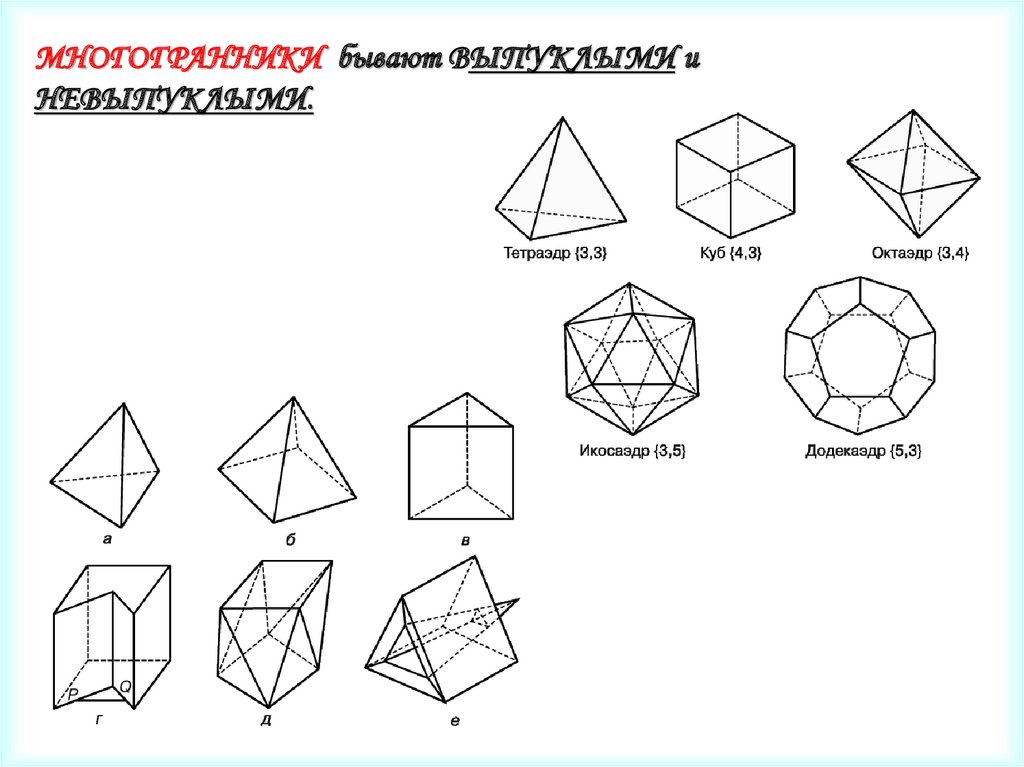 МНОГОГРАННИКИ бывают ВЫПУКЛЫМИ иНЕВЫПУКЛЫМИ.