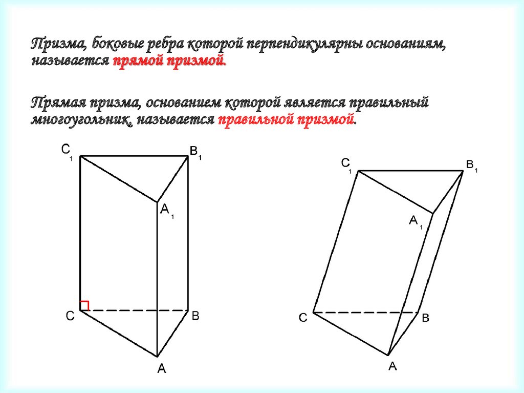 Призма, боковые ребра которой перпендикулярны основаниям,называется прямой призмой.