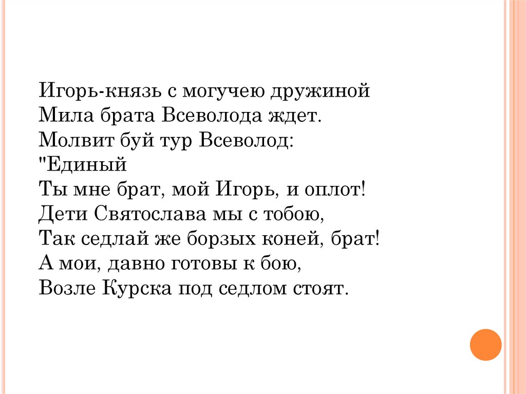 Игорь-князь с могучею дружинойМила брата Всеволода ждет.