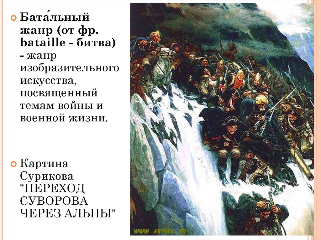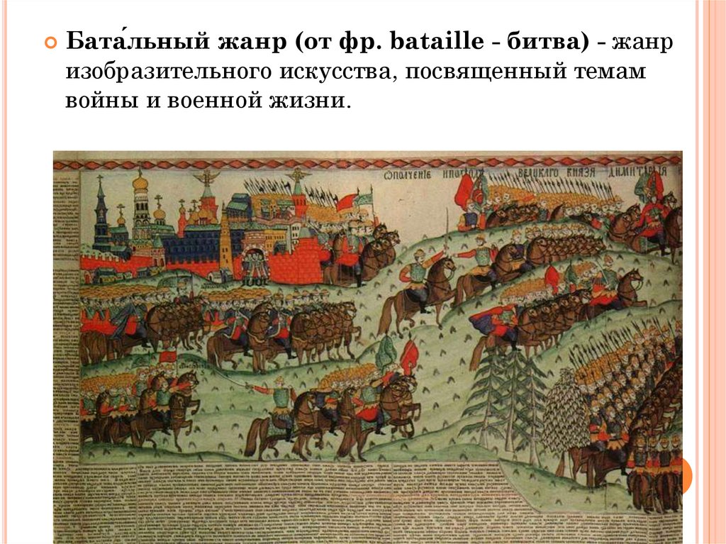 Бата́льный жанр (от фр. bataille - битва) - жанризобразительного искусства, посвященный темам