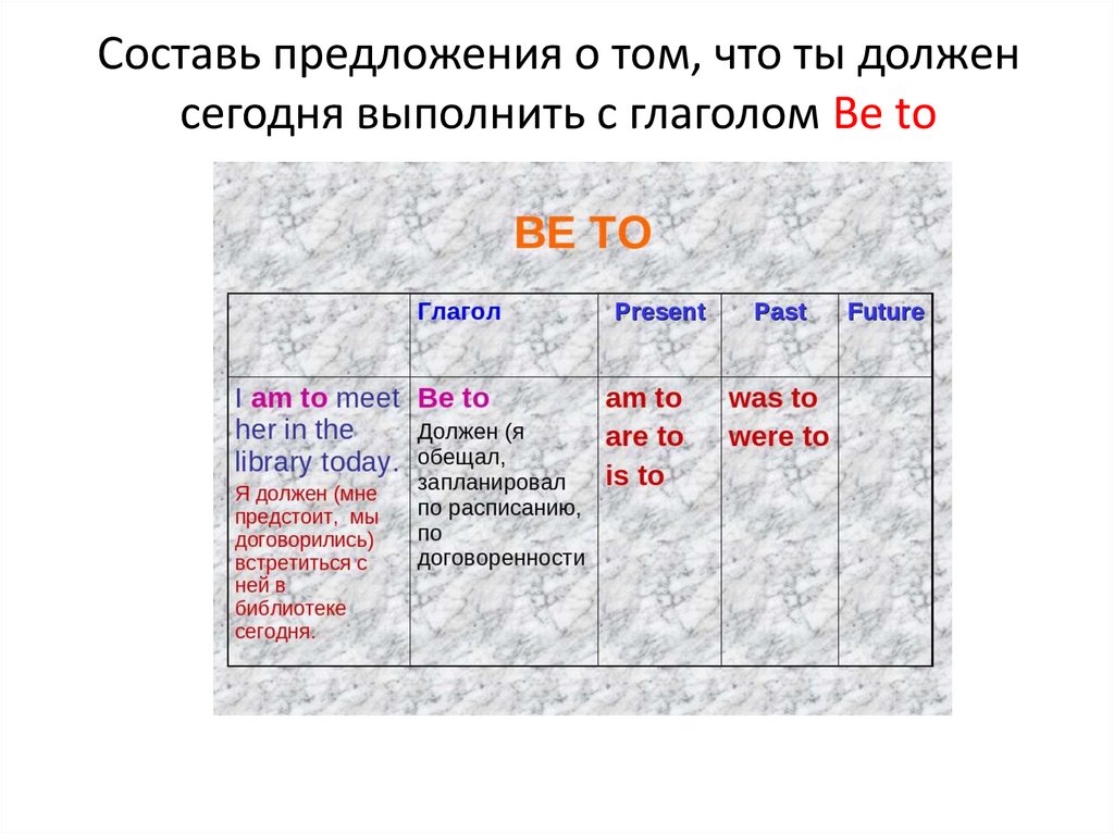 Составь предложения о том, что ты долженсегодня выполнить с глаголом Be to