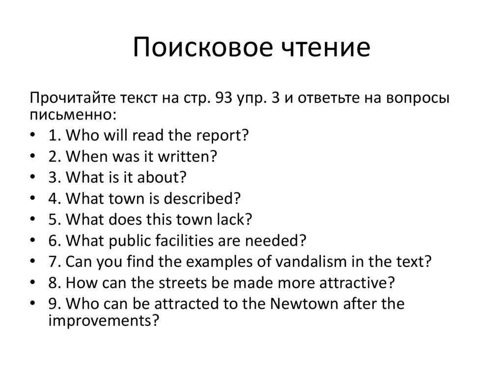 Поисковое чтениеПрочитайте текст на стр. 93 упр. 3 и ответьте на вопросы