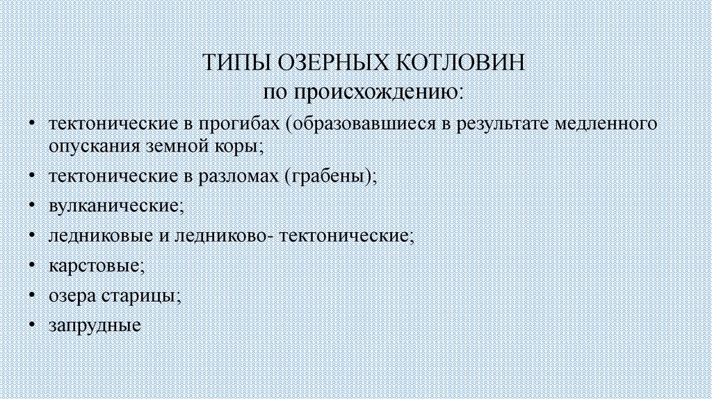 ТИПЫ ОЗЕРНЫХ КОТЛОВИНпо происхождению: